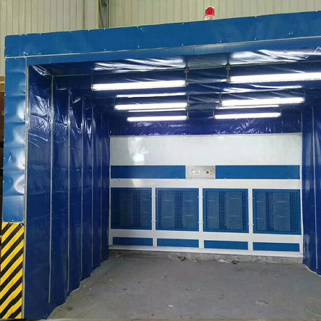 3、伸缩移动喷漆房整体为框架传动结构,每组框架间均有阻燃PVC布密封连接,安装快捷、外形美观,结构精巧,使用方便;